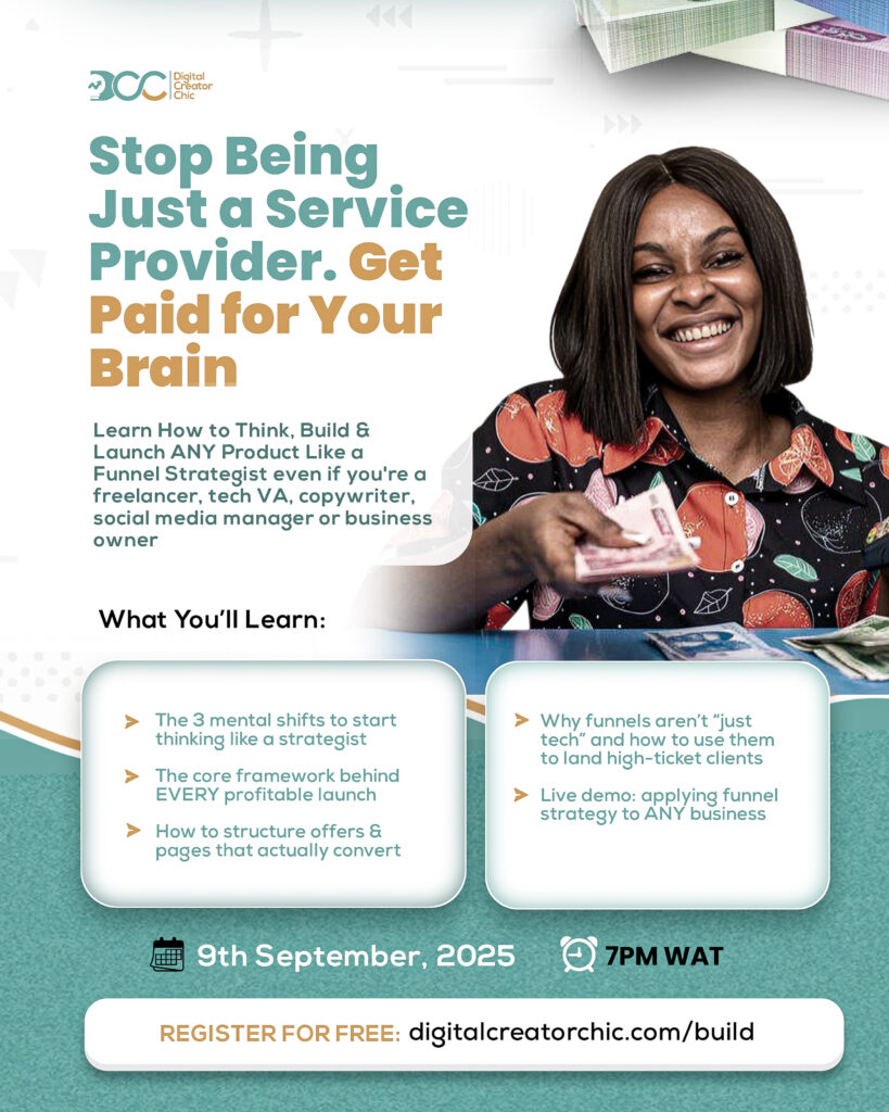 Stop chasing clients and start charging for your brain. In this free live webinar, I’ll show you the exact framework to think, build, and launch like a sales funnel strategist,  no matter your niche.