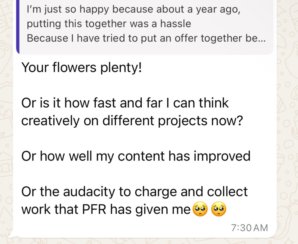 Got my first 2 clients after PFR. This also made me a better strategist and became confident in my work and how I charge.