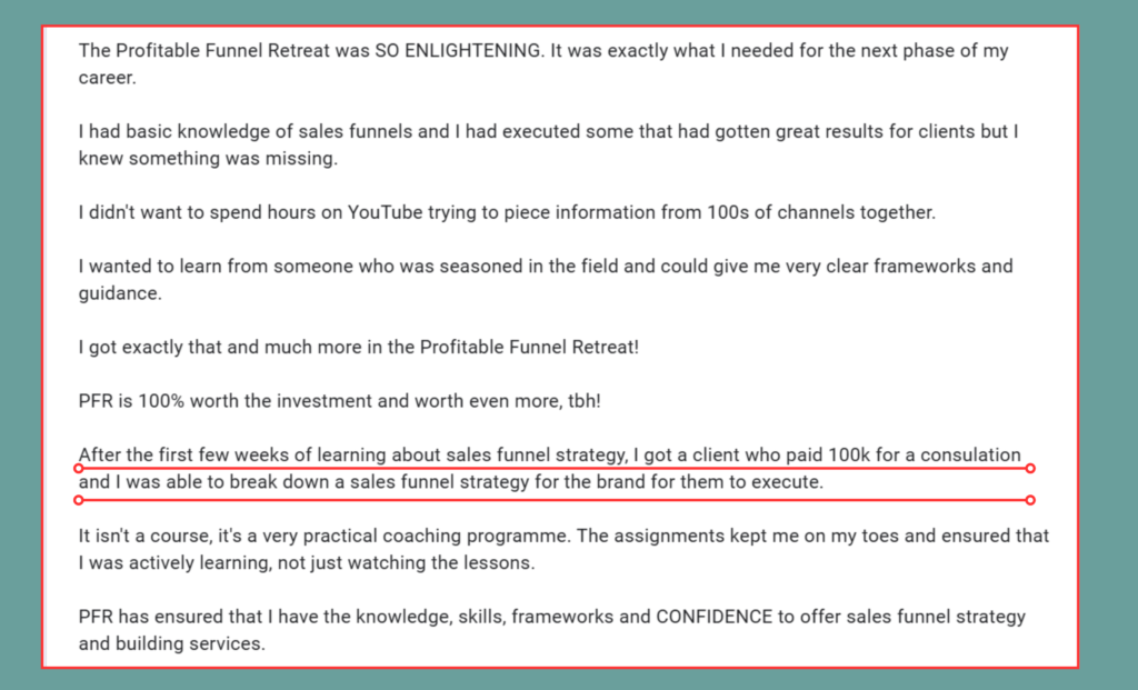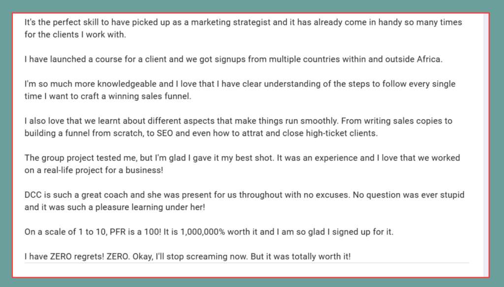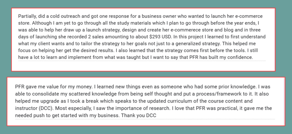 PFR is the most comprehensive program on sales funnels I have ever seen. It gave me confidence and I also made 6 figures co-working on a project with someone.